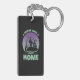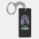 The black background creates a classic and sleek look while the sea green font in a Halloween font adds a pop of color. The circular picture on the front of the keychain features a creepy haunted house with barren trees, birds, and bats in the sky against a purple background, making it a perfect choice for anyone who loves spooky and modern Halloween style.