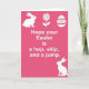 Soft colors and a deeply saturated magenta background set a lively stage for crisp white artwork. Centered on the card, a short Easter phrase sits in simple sans-serif lettering, with the words arranged in a tidy stack that reads easily at a glance. In the upper left, a small white rabbit silhouette 🐰 faces inward, as if leaning toward the message like a quiet hello. A second rabbit in the lower right mirrors the first 🐇, creating a gentle back-and-forth that feels like a friendly exchange across the page. Near the top center, a multi-petaled flower 🌷 adds a soft touch, like a small token passed between close friends. Beside it, a decorated oval egg shape in white brings in a festive detail without adding extra texture. The white text and icons stand out sharply against the magenta field, with the rabbits placed diagonally from upper left to lower right.