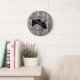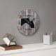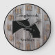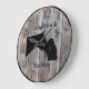 Personalize this custom barnwood styled clock with your farm, ranch, or stable name to add a personal touch to the decor. Barnwood look clock face with horse and owner showing affection silhouette in center. Choose one of two sizes and two colors of clock hand, whichever is to your liking.
