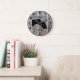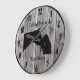 Personalize this custom barnwood styled clock with your farm, ranch, or stable name to add a personal touch to the decor. Barnwood look clock face with horse and owner showing affection silhouette in center. Choose one of two sizes and two colors of clock hand, whichever is to your liking.
