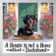 The phrase "A House Is Not A Home Without A Dachshund" is rendered in a warm, inviting, hand-lettered font, either arching over the scene or gently wrapped around the illustration. Subtle accents—hearts, little paw prints, or whimsical swirls—add charm and emotional impact. The color palette blends soft, homey browns, creams, and gentle pops of teal, gold, or coral, making the design inviting and versatile for a wide range of products.