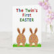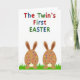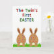 This card features a bright white background that lets the spring scene feel airy and open, with a sense of closeness suggested by two matching figures posed side by side 🐰. Across the top, a celebratory headline sits centered in rounded letters, each character colored red, blue, or green with a light speckled texture. The text feels upbeat and childlike in shape, spaced evenly so it reads clearly from a distance. Below, two plump, egg-shaped bunny forms in warm earthy tones stand like a pair, their gentle symmetry giving the impression of companionship. Each has curved ears on top and a small, soft-toned face near the bottom, with tiny features that seem to glance forward together 🐇. Their bodies are dotted with small circular spots in red, blue, green, and yellow, like candy-like confetti scattered across the surface. At the base, they rest in stylized, bright green blades of grass that rise in short strokes around their feet.