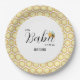 "A little Babee is on the way" on honeycomb pattern Customizable date Baby Showerpaper plate. A honeycomb pattern frames the plate. A cute baby bumblebee is sleeping on the text in the center of the napkin.