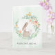 An adorable little bunny rabbit sniffs one of the pink roses in a pretty floral wreath on the front of this birthday card. A little yellow bird sits on top of the wreath, looking rather smug. The text at the bottom says "A little bird told me..." The sentiment is continued on the inside of the card, which states "It's your BIRTHDAY!" There is a second text field on the inside that you may customize. The card is finished with a pretty matching floral bouquet design at one side. All the images are in delicate watercolor, with a pale blue green watercolor wash on the front. Appropriate for birthdays at any age.