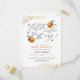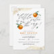 A little cutie is on the way! Celebrate the mom-to-be with this design featuring that phrase in elegant script lettering, with hand-painted oranges and green leaves. Your shower details appear below in modern typography. There is faux gold glitter in the top left and bottom right-hand corners.
