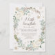 "A little snowflake is on the way" baby shower invitations featuring winter floral, gold and silver snowflakes, and leaves.