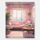 A living room with a sofa, a table, a lamp and a window. The sofa is covered with pillows and blankets. The table has a plant and a cup of coffee. The window has pink curtains and the sofa is the same color.