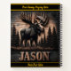 A beautifully detailed wooden carving showcases a moose amidst tall trees, celebrating nature's artistry in a warm, rustic setting.