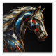 A side-view portrait of a stunning horse in abstract style. This artwork features an artistic stained glass technique with golden lines, filled with vibrant red, blue, orange, black, and silver hues against a dark background. The result is a majestic portrayal of a stallion exuding regal splendor.
