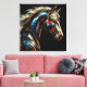 A side-view portrait of a stunning horse in abstract style. This artwork features an artistic stained glass technique with golden lines, filled with vibrant red, blue, orange, black, and silver hues against a dark background. The result is a majestic portrayal of a stallion exuding regal splendor.
