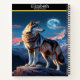 A magnificent wolf stands atop a rocky outcrop, gazing at a luminous moon in a twilight sky. The landscape is adorned with distant mountains and dark forests, creating an enchanting atmosphere that captures the beauty of nature at night.