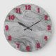 A clock with grey tints and a marble looking background, and dark red numbers.