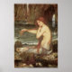 This oil painting is of a mermaid sitting on the shore. She is combing her long red hair. There are large stone formations in the background.