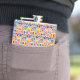 A metal flask with a vibrant geometric pattern, featuring colorful shapes in blue, yellow, pink, and orange hues, shown from front and side views.
