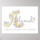 Pretty A monogram art name poster perfect for a girls bedroom or playroom in shades of gray, white, yellow, pink and purple. Personalize with your child's own name beginning with A, and name meaning for a truly personalized touch to your child's bedroom or nursery, this example is for the name A Alanah A fair precious beauty, harmonious and cheerful. Cute poster print ideal for a new baby, christening or baby shower gift. © Unique A monogram hearts and flowers drawing description and graphic art design by Sarah Trett. www.sarahtrett.com for www.mylittleeden.com