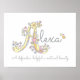 Pretty A monogram art name poster perfect for a girls bedroom or playroom in shades of gray, white, yellow, pink and purple. Personalize with your child's own name beginning with A, and name meaning for a truly personalized touch to your child's bedroom or nursery, this example is for the name A Alexa A defender, helpful a natural beauty. Cute poster print ideal for a new baby, christening or baby shower gift. © Unique A monogram hearts and flowers drawing description and graphic art design by Sarah Trett. www.sarahtrett.com for www.mylittleeden.com
