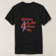 My 11 yo wore adult XL (5’7” 165#). The 8yo is small framed. She wore adult small and tied it in the back. Grandma wore adult large with long sleeve shirt underneath. Tall girl adult medium. Dark haired male adult large. Good quality dark Heather gray, Gildan brand shirt. -it was next up from basic choice and cost about $20 per shirt. Not too thick or thin. Washed and dried well, no major shrinkage. Not see-through. Can wear a bra under it fine. Screen print is just as shown and well done, front and back.