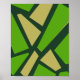 This abstract composition showcases a mosaic-like arrangement of irregular polygonal shapes, primarily in earthy tones of green and dark muted yellow earthy. Each segment is outlined with dark green borders, creating a sense of separation and rhythm across the design. The interplay between sharp angles and asymmetrical geometry evokes a feeling of controlled fragmentation. Some dark yellow earthy shapes resemble trapezoids and parallelograms, adding architectural undertones to the visual. The overall aesthetic is both grounded and dynamic, suitable for modern design contexts that value texture, depth, and geometric abstraction.