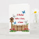 This design shows the message “A Mother makes a house, a home” centered near the top in deep red lettering that stands out against a white background, like a loving note meant to be noticed ❤️. The words sit with plenty of open space around them, giving the page a calm, airy look that feels like a quiet moment shared together. Beneath the text, a light wooden picket fence stretches across the scene with a small gate, suggesting a welcoming entrance and the comfort of being let in. On the left side, a simple birdhouse on a post adds a nurturing touch, as if it’s keeping watch over a cozy yard. Along the bottom edge, textured grass holds clusters of four-petal red flowers and leafy green stems, bringing in a gentle garden warmth 🌼. Around the lettering, four small winged insects hover—two in rich blue and two in soft white—adding movement like little companions circling a sweet message. The fence boards are pale and slightly weathered, with the gate centered and the birdhouse positioned just to the left above the grass line.