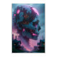 A visually overwhelming and profound piece of cyberpunk and dystopian art. A colossal, abstract head structure, fractured with metallic plating and glowing with intense neon pink and cyan light, dominates the skyline above a humble, decrepit town. The composition powerfully captures the unsettling contrast between future technology and decay, evoking a sense of human obsolescence and high-tech ruin. A superb, atmospheric statement piece for collectors of sci-fi and dark urban fantasy.