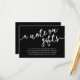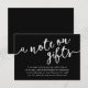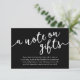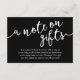 Celebrate the beginning of your journey together with our elegantly rustic modern classy black theme, crafted "A note on gifts" wedding invitation enclosed card, wish, cash. Featuring a sophisticated blend of modern script and romantic allure, each card is meticulously designed to convey the essence of your special day. Perfectly suited for couples seeking a unique way to share their honeymoon dreams, this card invites your loved ones to contribute towards unforgettable experiences. Whether nestled in a luxurious envelope or presented alongside your wedding invitations, our card adds a touch of enchantment to your celebration, promising cherished memories that last a lifetime. Designed by TeeshaDerrick.