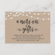 A note on gifts card. Modern rustic wedding, brown kraft, cottage string lights theme.