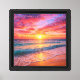 he picture shows a stunning beach at sunset, with golden sand in the foreground, gentle waves rolling onto the shore, and a vibrant sky filled with shades of orange, pink, purple, and blue. The sun is low on the horizon, casting colorful reflections across the ocean.