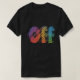 A t-shirt design featuring the text "OFF" in a futuristic, pixelated font, with a neon color palette. The design evokes a sense of technology and cyberpunk, with a playful and energetic vibe.
