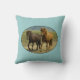 A totally cute and adorable photo capture of 2 icelandic ponies trotting down a dirt road in an oval frame. One is a bay and the other is chestnut colored. Their gorgeous manes blowing in the wind. A beautiful mountain landscape can be seen in the background and adds a sense of wonder to this image. Appealing to horse lovers and equestrians of all ages. The pillow color is a faded retro green, but can be changed easily to any color you wish from the color palette.