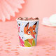 A paper cup with the character red fox in it looks at a bird. The fox is holding a cup of coffee. The illustration is in a flat style in pink and green and blue shades.