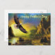 A beautiful rocky mountain landscape with a bald eagle with wings outstretched flying gracefully above this scenic rustic landscape. A patriotic symbol. Happy Father's Day written in a yellow handwritten font.