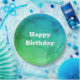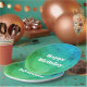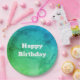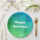 Teal, and green paper plates, happy birthday themed text can be personalized to any special event.