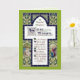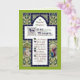 Spread the Good News to family and friends that “He Is Risen, He Is Risen” with this handsome card simulating stained glass in rich dark blues, bright spring greens, soft warm yellows, and silver grays. Done in the Liberty Style, the British version of Art Nouveau, a large central cross containing text forms the focal point. Two small panels depicting stylized Easter lilies fill the spaces between the cross’s transverse beam and the top part of the upright. Two long rectangular panels flank the lower part with figured scenes representing two seated angels at the empty tomb on the left and the Three Marys come to anoint the body of Jesus on the right. The text reproduces the lyrics of an English hymn composed in 1846 by Cecil Frances Alexander (née Humphreys; 1818-1895), a poet and writer of hymns, especially hymns for children. + Inside: Details of the two lateral panels with figures arranged side by side. + Image Credit (RT 01): Antique images from an embossed postcard in chromolithography entitled A Peaceful Easter, Easter Hymns Series, No. 714, originally published by Raphael Tuck & Sons, London, England, and printed in Saxony, Germany, 1912, from the designer’s private collection.