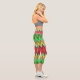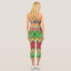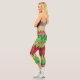 A person is wearing vibrant, geometric-patterned leggings in reds, greens, and yellows, paired with a gray crop top and white sneakers, standing casually.