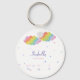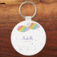 This is a personalized birth announcement button key chain with colorful designs and customizable details according to your personal preference