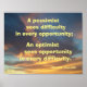 A PESSIMIST SEES DIFFICULTY CHURCHILL POSTER is an item in THE HOUSE OF SUNSHINE line of fine art reproductions placed on products designed for use in home or office.The WINSTON CHURCHILL PHRASE is placed on a reproduction of an original photograph by Kentucky artist, GERRY K. FURGASON. The work is included in her SOUTHERN DRAWLS series of words to live by and phrases to remember.