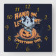A playful ghost overthinking by a carved pumpkin square wall clock