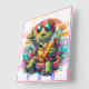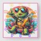 A cheerful turtle in sunglasses rides a skateboard while holding drinks, radiating fun and summer joy at a lively gathering.