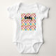 This baby bodysuit has a mid-century modern design of flowers made from squares, ovals, and diamonds that have been manipulated to form flowers.