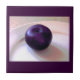 A purple plum, a ripe plum, a shiny plum is the subject of the original photograph by ZoeSPEAK on this small Ceramic Tile. We see the round fruit as it sits on the curves of a white plate, throwing its oval shadow in pastel colors across the dish which sits on a textured pastel background. This closeup photo of a plum shows off the plum's curves around the top with a highlight in a light cobalt blue color. Almost taking center stage on the light background, this richly dark colored plum is the star of the show, delicious! The background color surrounding the photo on the ceramic tile is a deep purple, picked up from the color of the fruit. However, this can be changed if you prefer by choosing "Customize". Enjoy the beauty of fresh fruit anytime with this tile.