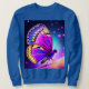 a purple and pink butterfly, kindness colors, three hearts arround color light blue, rose background, a lot of glitter, and golden stars, letters love