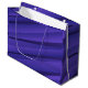 A purple gift bag with a wavy, abstract pattern and white handles is shown at an angle. The design is bold and modern, conveying a festive feel.
