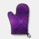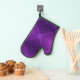 "A purple oven mitt with a quilted diamond pattern on the front and a solid black back. The mitt has black edging and a hanging loop."