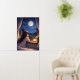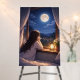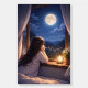 This serene illustration captures a quiet, introspective moment as a young girl gazes out of her window at the luminous full moon. The soft glow of moonlight fills the night sky, casting a calming blue hue over the distant hills and the warmly lit village below, creating a beautiful contrast between solitude and life.
