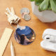 This serene illustration captures a quiet, introspective moment as a young girl gazes out of her window at the luminous full moon. The soft glow of moonlight fills the night sky, casting a calming blue hue over the distant hills and the warmly lit village below, creating a beautiful contrast between solitude and life.