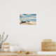 Restful waves caress the shore of this peaceful seascape, where boats rest quietly upon the tranquil sands, under a still blue sky. A colorful stylized watercolor in gentle blues and sand colors.