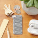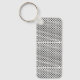A rectangular keychain with a metal ring and a black and white polka dot pattern on both sides, set against a plain gray background.