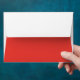 a red background with a white border envelope