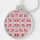 A round keychain featuring a colorful floral pattern with pink and purple flowers on a white background. It's shown close-up and resting on a desk beside a phone and notebook.