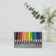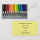 A row of pointy well sharpened colored pencils sitting on a gray granite desk. A nice spectrum of colors from the rainbow. Blue, purple, green, yellow, orange, pink, red, brown and black. Personalize with your business details. Suitable for teachers, tutors, educators, art teachers, art supply sales and consultants.